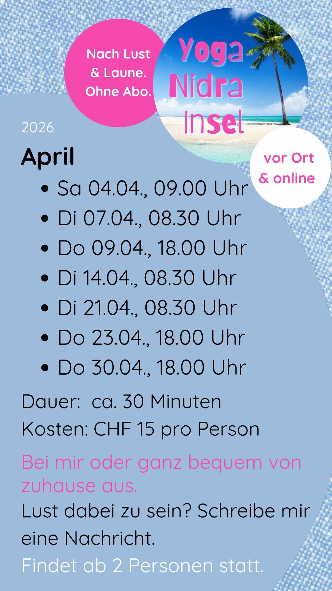 Wenn du die Einführung schon gemacht hast, findest du weiter unten die aktuellen Termine der Yoga Nidra Inseln.